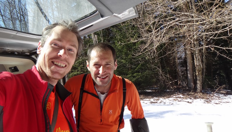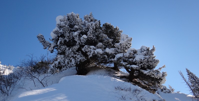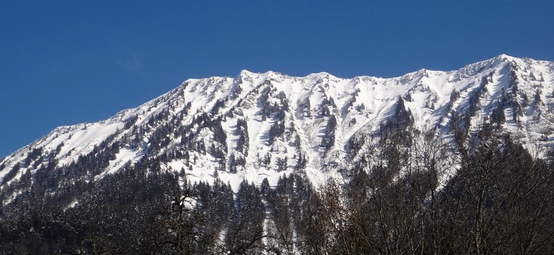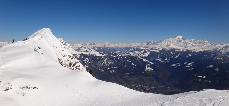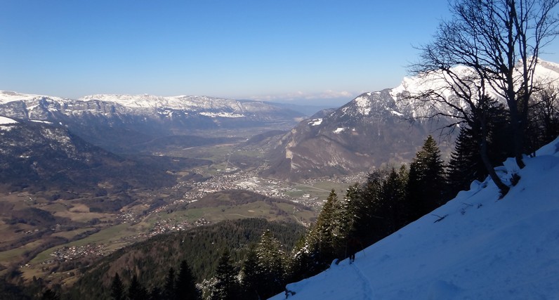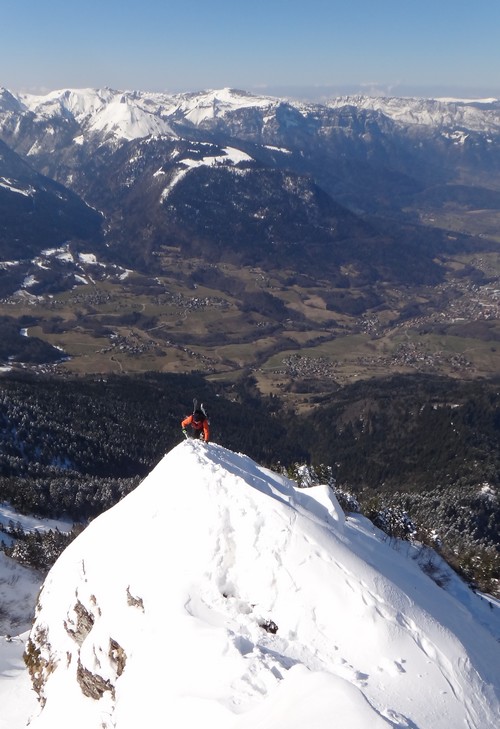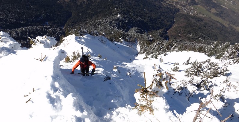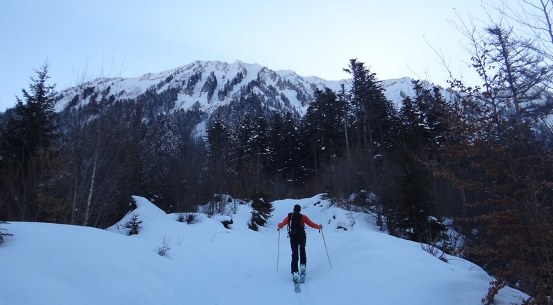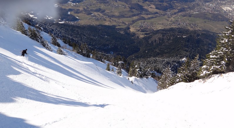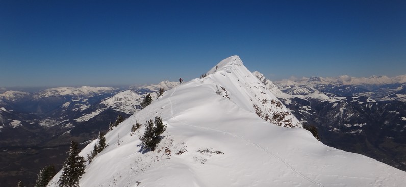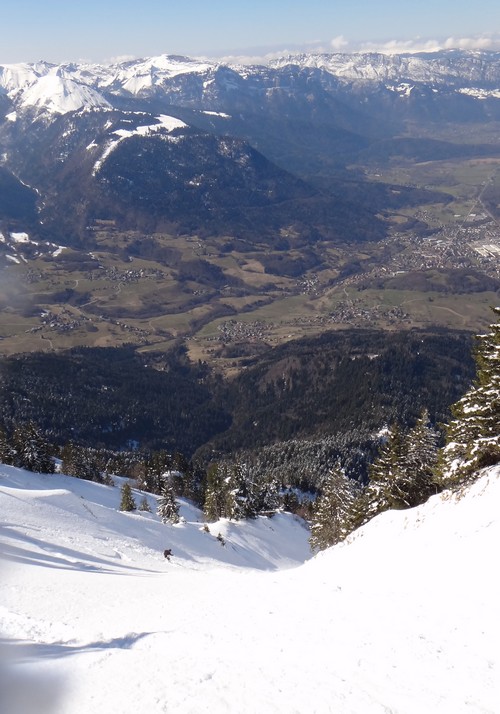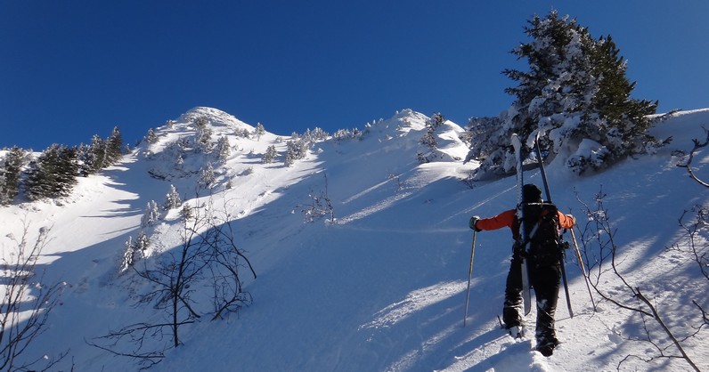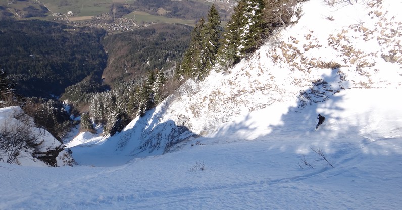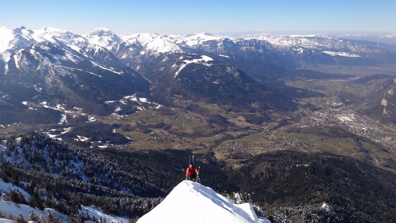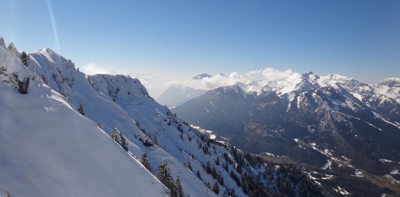 On voulait skier un peu raide dans les Bauges... Manque de chance deux skieurs nous grillent la priorité au Pecloz par la Grande Faille... Pas envie de suivre des traces, on opte alors pour cette Dent de Cons et son versant Nord...