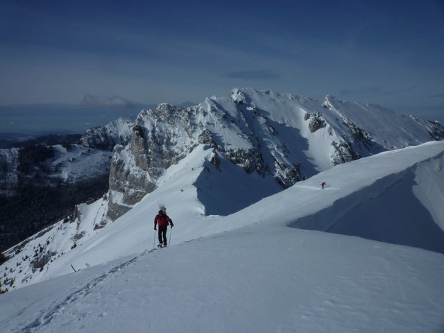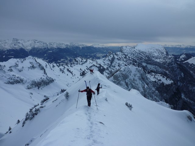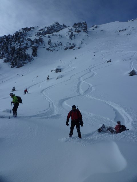 La sortie du Mardi, toujours réussie :-) Une grosse collective de branleurs... Montée sous un ciel voilé en altitude puis cela se dégage avec du soleil, de la poudre, des conditions extrêmes !!! Une boucle bien pensée avec un couloir pour brasser un peu, un bout d'arête des Lances de Malissard pour se croire alpiniste et une face avalée en trois virages genre Free-Ride Nissan Contest ! Deux repeautages pour profiter au maximum de cette neige fraiche et nous voila dans une dimension parallèle... On est bien sur terre ?!